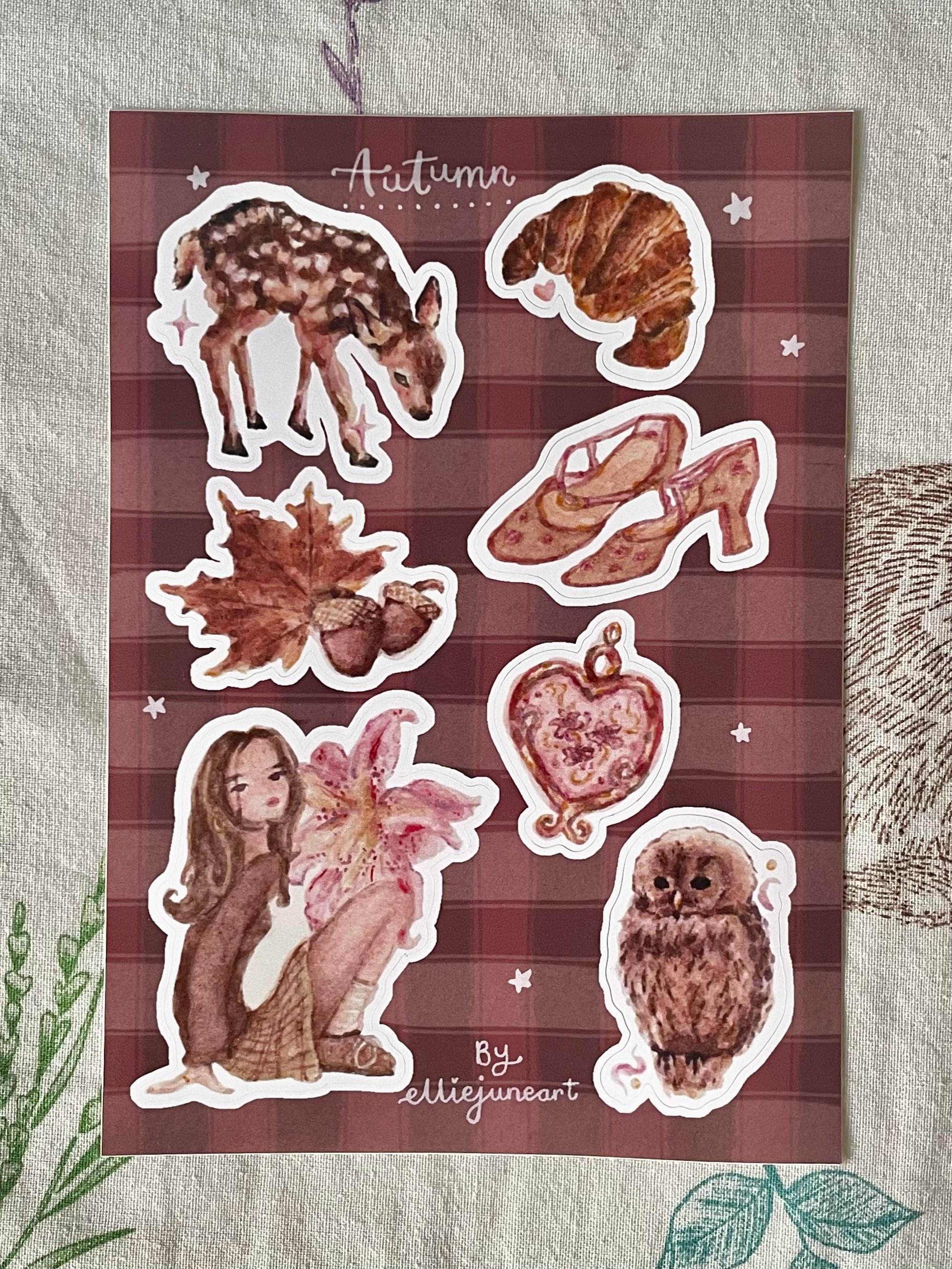 sticker sheet made from my watercolour paintings <3 A6 size sheet including 7 stickers printed onto 100 microns thick monomeric gloss vinyl